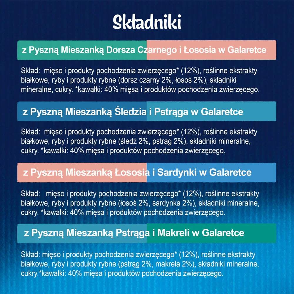 Felix Duo Fisk i Gelé är en fullvärdig kattmat avsedd för vuxna katter och är även lämplig för kastrerade katter. Denna produkt är framtagen för de som önskar ge sina katter en förstklassig smakupplevelse med noggrant utvalda fiskrätter i gelé. Varje förpackning innehåller en kombination av läckra fiskar som är speciellt utvalda för att tilltala de mest kräsna kattgommen. Förpackningen erbjuder en utsökt blandning av flera olika fiskkombinationer.