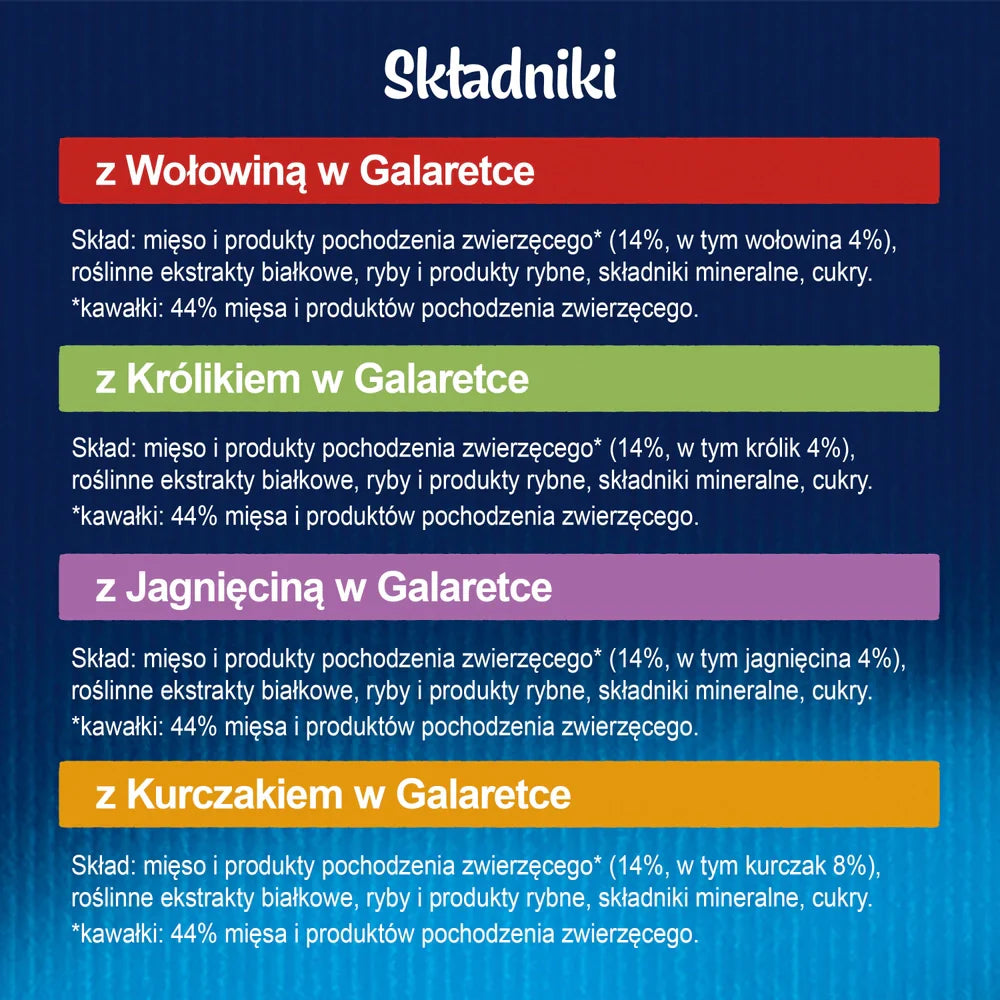 Med lamm: kött och animaliska biprodukter (14 %, varav lamm 4 %), vegetabiliska proteinextrakt, fisk och fiskprodukter, mineralämnen, socker.