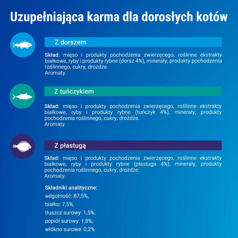 Sopporna är avsedda att ges tillsammans med ett fullvärdigt helfoder och bidrar samtidigt med vätska, vilket kan vara ett värdefullt tillskott i kattens dagliga vätskeintag.