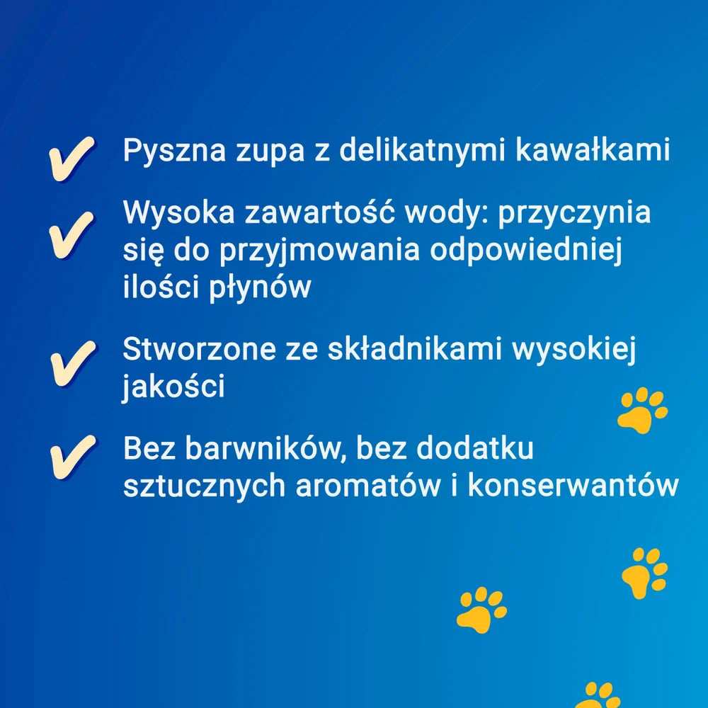 Felix Soup Original är ett flytande kompletteringsfoder för vuxna katter som består av smakrik buljong med mjuka bitar av fisk. Portionerna är förpackade i praktiska påsar som gör det enkelt att servera som ett extra inslag i kattens dagliga utfodring. Den höga smakligheten gör produkten särskilt uppskattad även av katter som annars är svåra att locka till matskålen.