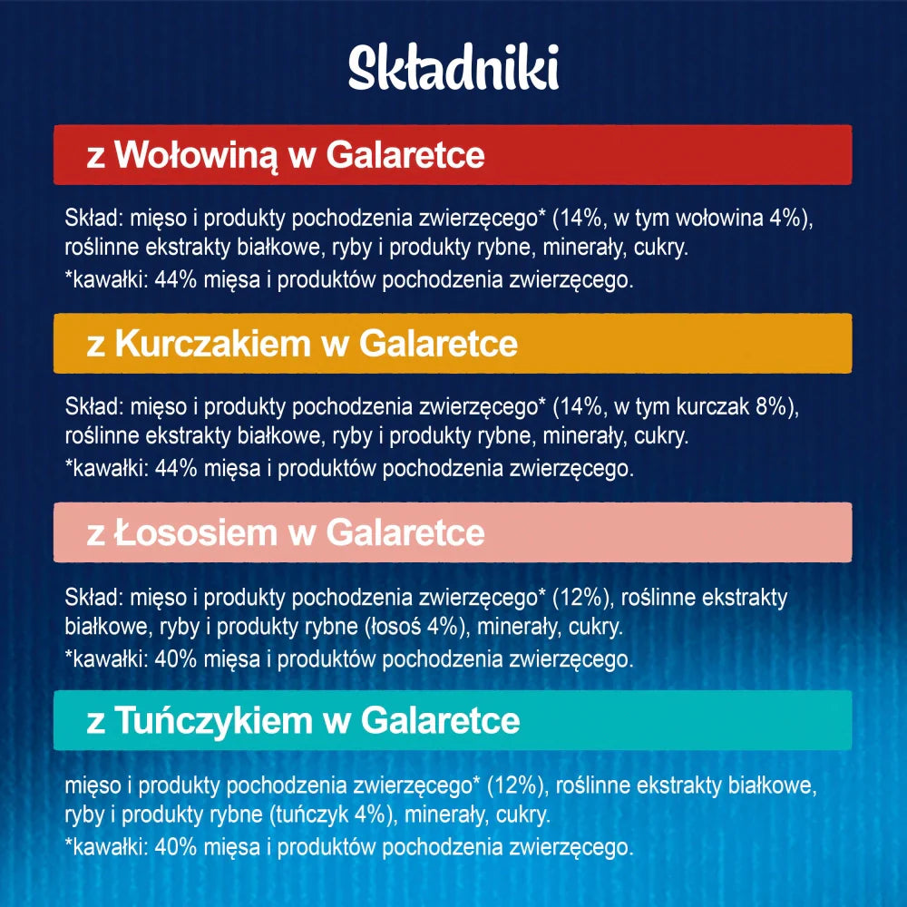 - Med kyckling: kött och animaliska biprodukter (14 %, varav kyckling 8 %), vegetabiliska proteinextrakt, fisk och fiskprodukter, mineraler, sockerarter
